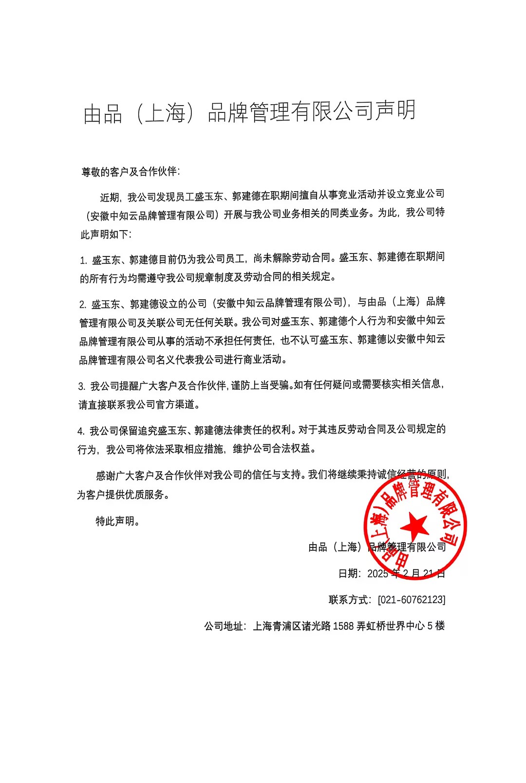 关于安徽中知云品牌管理有限公司冒充我司分公司开展业务声明